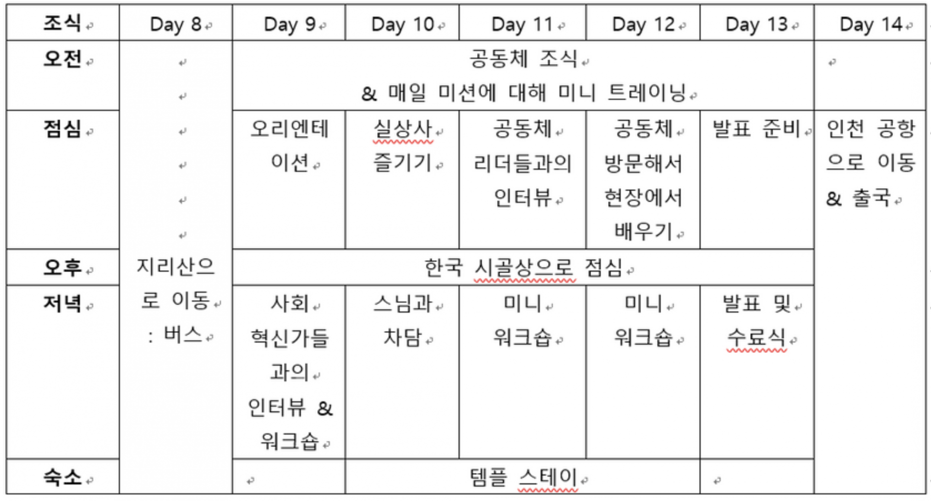 가슴이 뛰는 커리어를 찾는 트레이닝: 연수 기간 동안 성찰하는 시간을 매일 갖기, 리스닝스킬, 다양한 관점을 갖는 연습, 문화적 인지력 높이기, 자신의 가치관을 발견하는 연습, 연대와 협력을 이해하기 등등